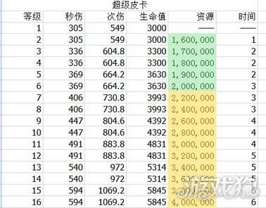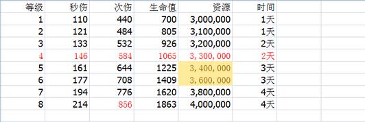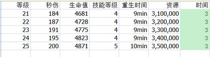 我们再来看一下战争机器的数据,现在王可以升到25级了,秒伤和生命值都有增加,升级时间都是3天,一共15天,还是可以接受的。