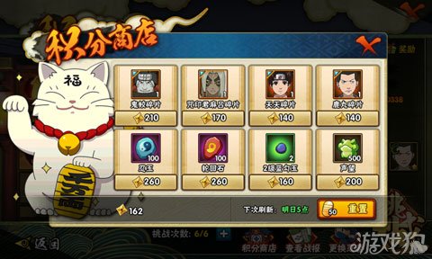 积分主要的兑换商品也就只有几大硬性的形式:忍者碎片、声望、勾玉、忍玉和轮回石,在游戏就只有积分商店、组织商店、和生存卷轴兑换。看个人喜好换吧,小编个人只在生存换了凯,其他换的勾玉,因为换声望,也没铜币升通灵兽,