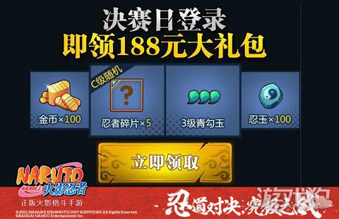 为了预祝首届忍者大赛总决赛圆满举行,所有于7月30日登录《火影忍者》手游的玩家,通过手Q活动,都将获得价值188元的决赛日登录礼包,内含大量金币、忍者碎片、勾玉与忍玉,具体活动链接请关注7月30日当天社区最新资讯