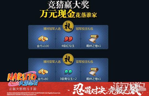 7月30日晚,游戏首届无差别忍者格斗大赛总决赛将于火影动画实境展正式举行。在游戏中百战成钢的8位选手将争夺最强忍者的殊荣!激烈的总决赛赛事线上、线下实时直播。所有粉丝皆可观看直播见证最强忍者的诞生!而作为对强者的激励,《火影忍者》手游将为冠军选手提供高达万元的现金奖励与50000金币奖励。其它强选手亦可根据排名获得数额不等的丰厚现金、金币奖励。