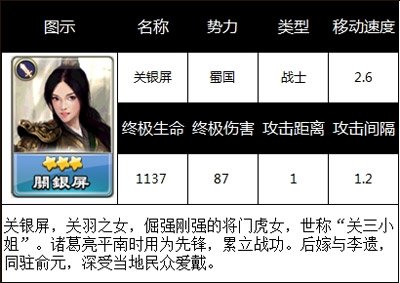君临天下女将关银屏基本资料解析,关银屏历史上是关羽的女儿,虎父无犬女,也是一名有名的女将。在游戏中关银屏是一名蜀国的战士,三星武将,本身属性除了速度还不错,其他的都比较普通。武将技能是主动技能偃月斩,伤害并不大,但是却可以群体为己方提升速度。武将天命是巾帼英豪和将门之女。