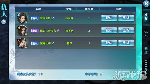 然后,复仇。玩家在游戏里经常莫名其妙的被人杀死,其后系统将自动的把杀死你的人作为仇人,玩家可进行复仇。每复仇一次即可夺取对方的银两,可谓是非常的哈哈哈。因为其将自己杀死,还得到了红名的奖励,而自己杀死仇人不仅可以获得银两还可以不用红名,何乐而不为?