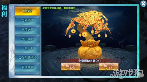 首先,我们要了解到银两不是想要就能够获得的,需要玩家付出一定的代价才能够获取。因而接下来我们要说的一个方法是:摇钱树。想必不少玩家早已经注意到这个项目了吧?每日免费一次,其后就需要进行20元宝一次或200元宝十次才能够继续摇晃金钱树。虽说,获得银两一般不多,但是偶尔人品爆发的话获得暴击,那将是天降银雨,侠客们将会获得用之不尽的银两。