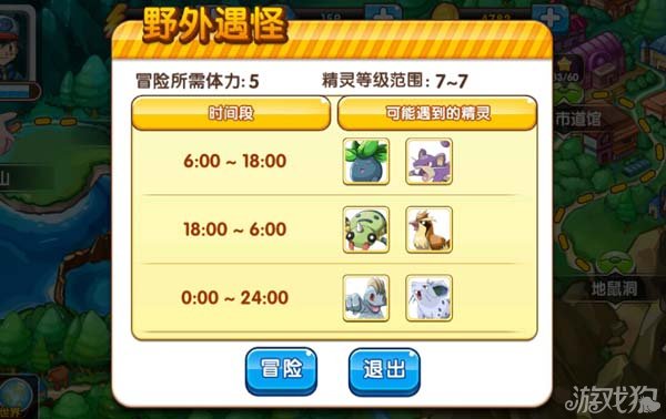 时间段6:00~18:00 出现精灵:走路草,等级7,出现几率:30%;小拉达,等级7,出现几率:30%