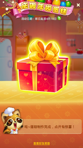 蛋糕制作完成之后,就会出现一个礼盒,点击开之后就是制作好的精美蛋糕。还可以获得惊喜礼品。这么有爱的一款活动,千万不要错过了。