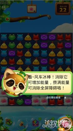 在右下角的位置,是风车冰棒,消除冰棒之后,就会积攒能量,只要消除的数量足够,积攒的能量值满值之后,风车冰棒就会散发出光芒,这样我们就可以直接的点击来释放能量了。