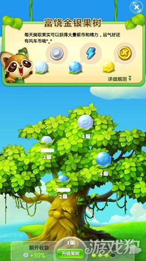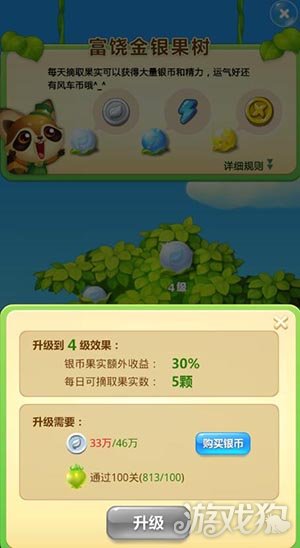 从三级果树升级到4级果树,除了银币的需求之外,还需要达到指定的关卡,只有通过100关的玩家,才可以升级果树。