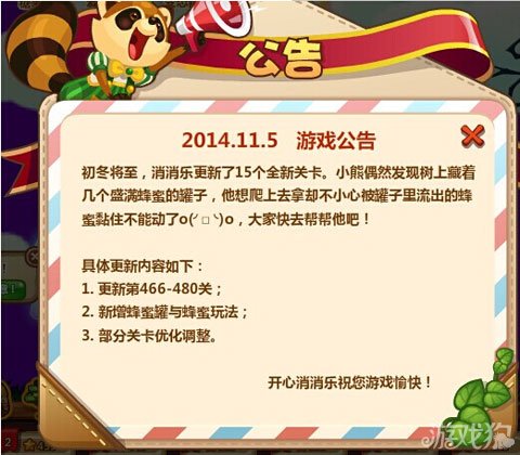 开心消消乐新一波好玩的关卡更新啦,466-480关全面开启另外有蜂蜜罐与蜂蜜新玩法的加入,很难想象小蜜蜂模式的是怎么玩的,具体是能给你的消除带来好处还是新的障碍物呢,只有体验过的玩家理解,顽皮的小熊这次闯了大祸新的十五个关卡需要你来拯救。