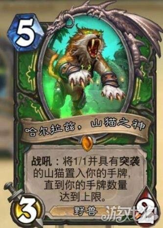这是我使用的中速猎的卡组中唯一改变的一张卡,就是这张草原狮。原来的那个卡组是只带一张草原狮和一张山猫之神。我选择放弃了山猫之神,带两张狮子。是我认为,山猫之神和DK有一个相似之处,就是会缓解当前回合的节奏,给后期一定的助力。在现在这个环境中,有奥秘猎,法术猎的威胁在(虽然马上不一定在了)。