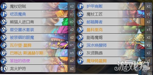 这个卡组获得法术的方式全靠衍生,用随机给和发现的法术来触发星空墨水套装的减费和触发英雄牌的战吼特效。如果护符射手可以靠笨拙的信使提前拉出来触发,邮箱舞者给的硬币就是为了提速这一爆发点,6费的灰贤鹦鹉也是为了最大化护符的效果。