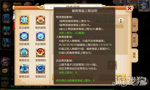 3.玩家可修炼的修炼上限与玩家自身等级(玩家45级时可以最高修炼4级,在此之后,每提升5级即可提高2级修炼上限)以及玩家所在帮派的等级有关(1级帮派上限10级,2级帮派上限15级,3级以及以上帮派上限20级)。