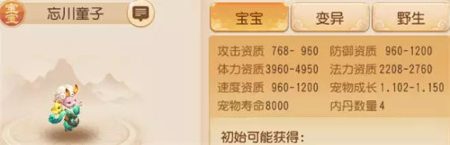 优势:忘川童子的体力资质和防御资质都非常不错,同时他的速度资质也不低。专属内丹以及宠物套装是最适合作为配速宠物战场的。它的必带技能有两个,算是比较多的。除此之外在技能方面的优势也很大。