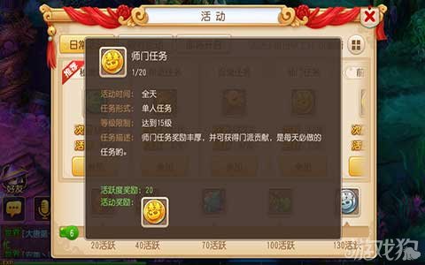 1、师门任务,每天二十次机会,这个任务应该是玩家最不可错过的吧。因为在游戏中师门任务完成以后总经验最少也是有二十万的,而且花费的时间也是非常短的喔。
