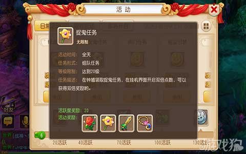 6、捉鬼任务,作为端游中的特色玩法之一,手游也是不例外的喔。在游戏中每天固定给的两百的捉鬼点数,经验是肯定非常多的,只不过需要一定的时间喔。而奖励也是随机获取的,有钱的玩家还是可以购买回梦丹来恢复捉鬼点数的喔。