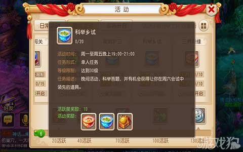 4、科举乡试,这个也是活动的任务,科举乡试的问题可以说是非常的丰富了喔。因为在游戏中可以说是问答难度最大的一个了,不过这个问答有二十个问题,玩家要是能够全部回答出来不仅会有经验道具的奖励,还有称号喔。