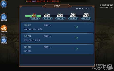 每天百晓任务在“指引”->“百晓任务”里面发布若干不同的任务, 任务目标多种多样,每个任务完成后奖励一定的活跃度, 积累到一定的活跃度即可领活跃度宝箱。 随着活跃度的增加,所领的奖励也越丰厚。