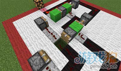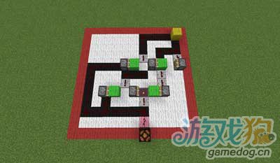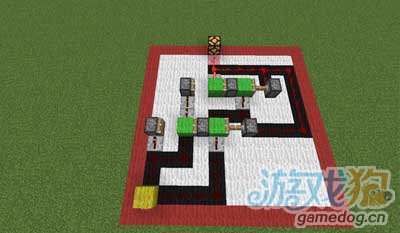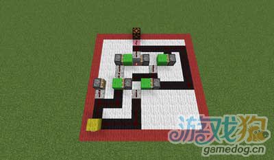 研究了几小时,研究出来一个按钮式开关,可以来当某些地图的隐藏开关之类的,下面放图讲解 整个电路的大小有点大,此为全貌 背面 按下按钮后.... 黑色羊毛上是红石线,绿色是实体方块,粉红色是输出,黄色是输入,白色是空气 注意,这个绿色方块下还有一格红石线