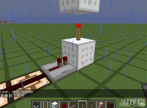 我们可以看到,雨天时红石信号只传递了11格(下面是红石灯用于检测红石信号,最后一个是被前一个激活的,所以不算) 于是中继器没有接到信号,红石火把亮起,激活命令方块,变成了无天气