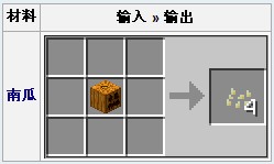 南瓜种子能够通过割收成熟期的南瓜梗或者放在工作台的方格中得到(见下文)。如果想知道更多的农业信息,请参见南瓜。