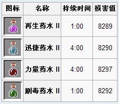 请注意:阶段II药水的持续时间永远是对应基础(即阶段I)药水的一半;所有延长版(阶段I)药水的持续时间都是对应未延长的阶段I药水的8/3。