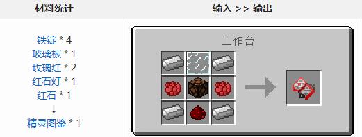 精灵图鉴的合成还是比较麻烦的,需要红石、玻璃、红石灯、铁锭和玫瑰红。其中最难的算是红石灯了,因为要用到萤石,建议大家做个传送门去地狱挖取。