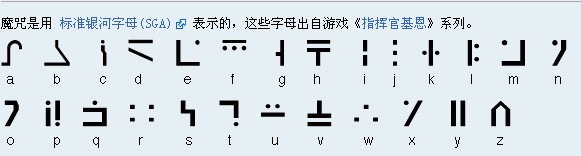 魔咒是用标准银河字母(SGA)表示的,这些字母出自游戏《指挥官基恩》系列。