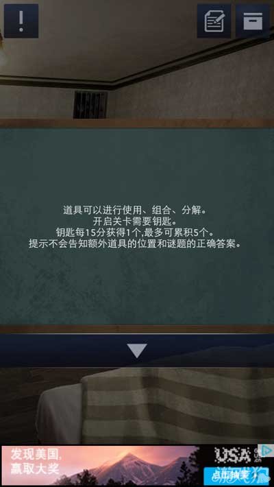 道具可以合成,分解,或者单独使用。开启新的一关的关卡需要钥匙。一个钥匙需要15分,身上可以积累5把钥匙。并且游戏中的提示不会直接告知答案。