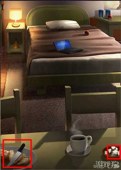 进入游戏后,先将画面拉到最下面。在桌子上找到切面包的刀,在咖啡的糖块中找到一个星星形状的糖块得到第一颗星星。