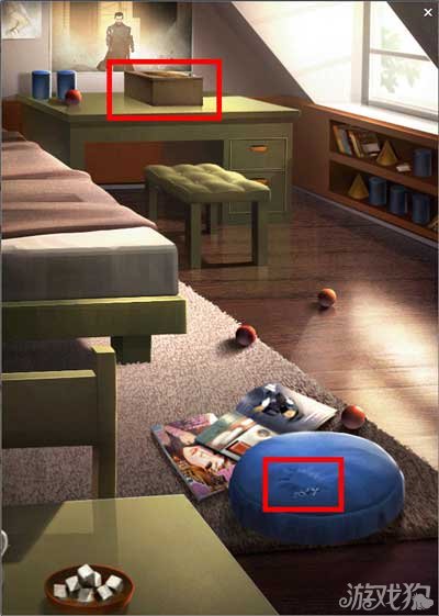 接着使用刚刚找到的刀,将蓝色垫子凸起的地方割开,得到没有芯片的门卡。然后点击书桌上的一个箱子。