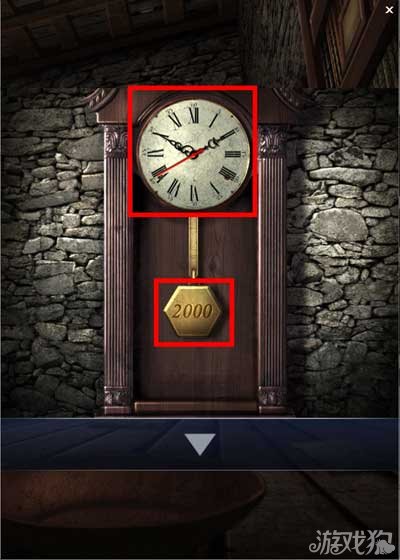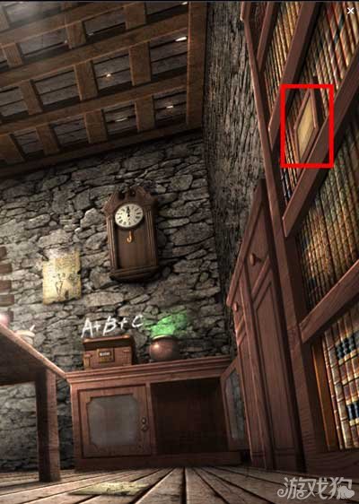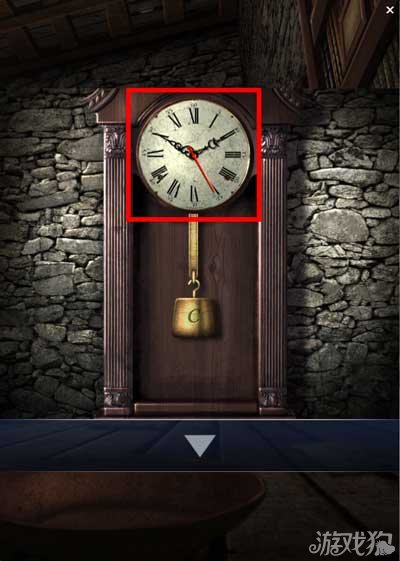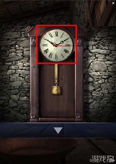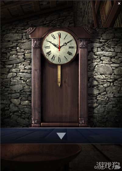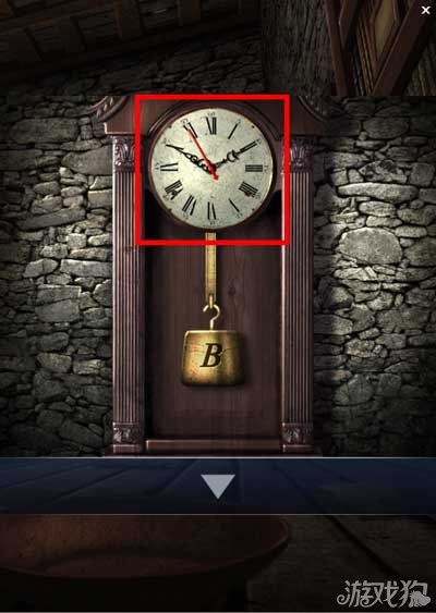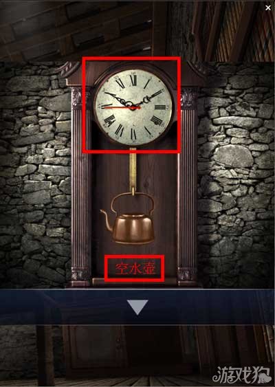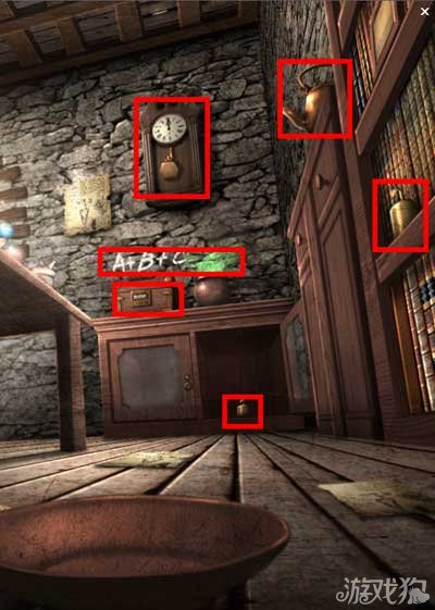 在书柜上找到一个砝码,小柜子打开后找到一个砝码。大柜子上找到一个空水壶。墙上A+B+C为密码箱提示。点击墙上的时钟。