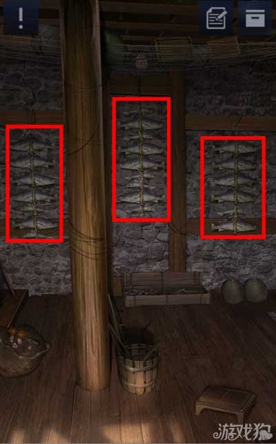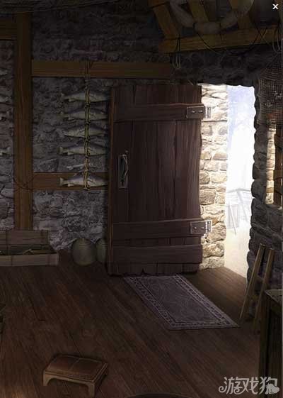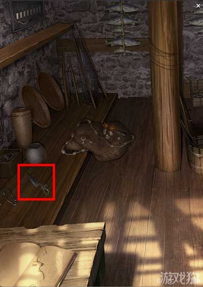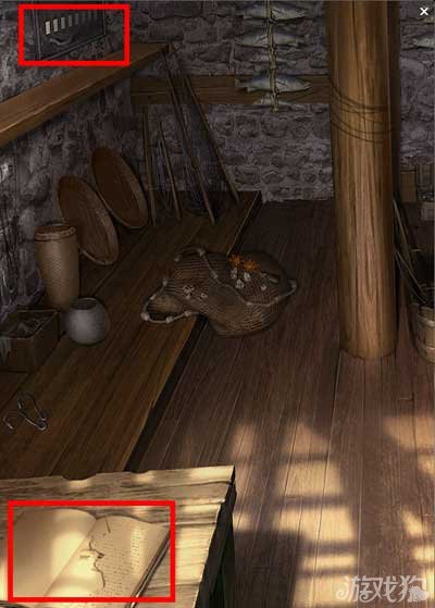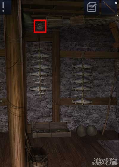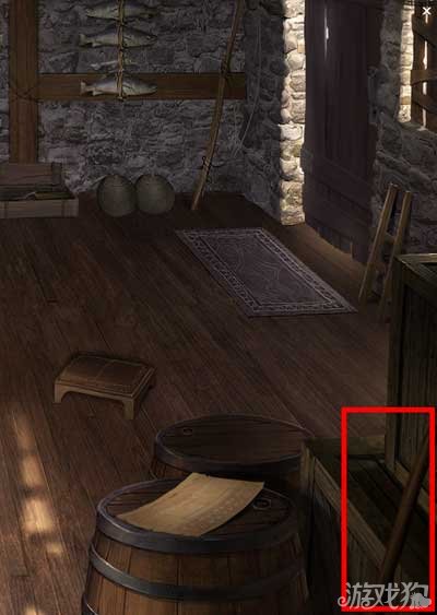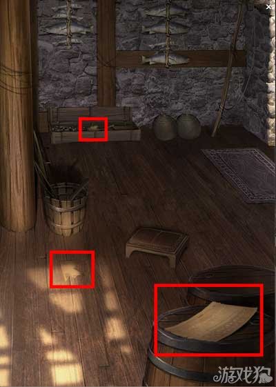 首先从地上和靠墙的箱子中找到两个纸条碎片。接着点击木桶上的纸。