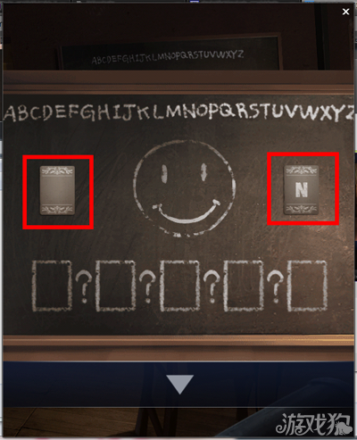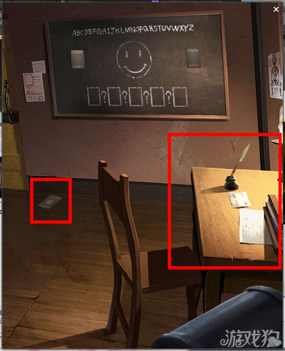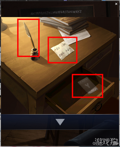 将桌子的抽屉打开取出字母Y,将桌上的纸条和羽毛笔拿起。接着检查黑板。