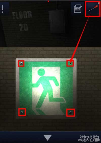 本关是在一个类似安全出口的地方,但是出口却被密码锁给锁住了。整个出口被其他的铁栅栏挡住了。而且密码锁的电断了,无法输入密码。所以玩家要修好电路,首先要能看懂电路的提示才能去修理。好好找一找各种工具去当电路修理工吧。