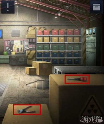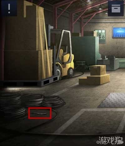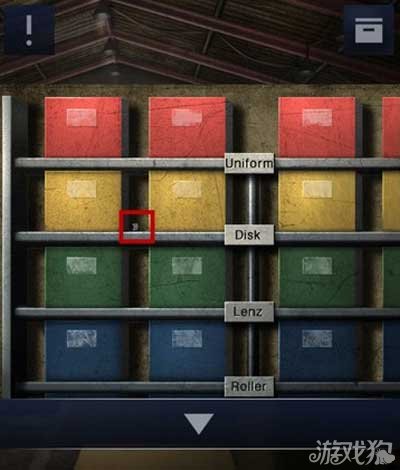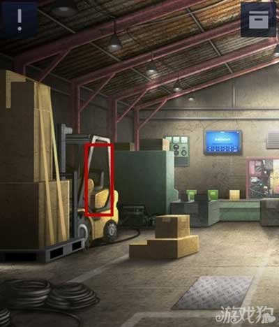 4、使用螺丝刀将螺丝卸下,揭下盖子之后将刚才的电线接上去,就可以启动叉车了。现在我们要怎么输入呢,大家先返回主界面,然后会看到一排正在动的不同颜色的箱子,在箱子边上有个放箱子的架子,点开之后你会看到每个颜色的箱子代表不同的东西,红色是Uniform,黄色是disk,绿色是Lenz,蓝色是Roller,而这四个单词的首字母分别是U、D、L、R,那么相对应的就是Up、Down、Left、Right,即上下左右,这时候大家再来观察一下箱子的流动顺序,是红蓝绿绿黄,那么相对应的就是上右左左下,这个时候答案就揭晓了,在左边输入上右左左下,即可开启房间门。