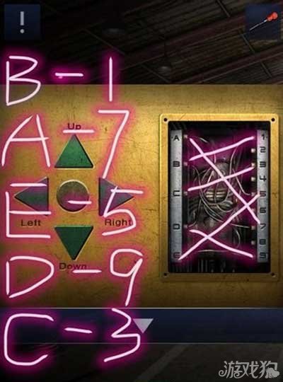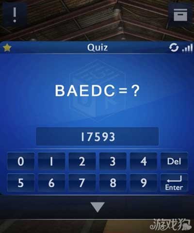 6、这一关的有点难,然后打开墙上电视屏幕,显示的是BAEDC=?,这个时候我们再回到拉货车让我们输入上下左右的那个界面里,就会看到右边的电箱里有两列,左边是字母,右边是数字,这时候我们要根据每一个字母上所连的电线终点接到哪个数字上面,可以发现A是7,B是1,C是3,D是9,E是5,那么答案就17593啦。