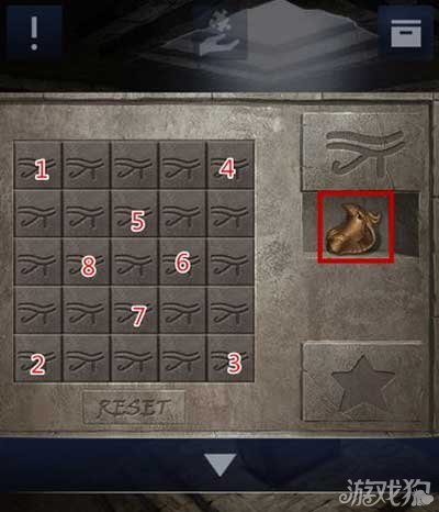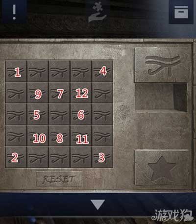 2、点击左边墙壁的石板,根据图中所示的点击顺序可以得到法杖的头部;