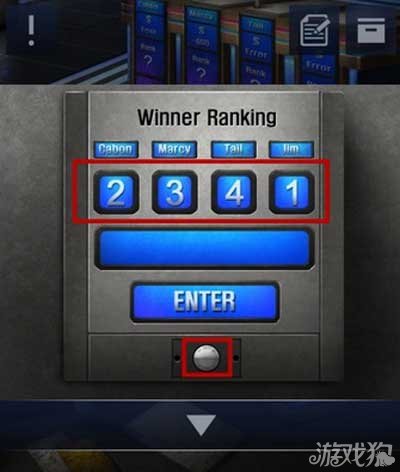 根据主持台上的计分表可知,第一轮Marcy得600,Cabon扣600,以此类推,得出4个人的分数分别由高到低分别为Jim 900、Cabon 0、Marcy -600、Tail -1500,所以最终的四个人的排名是2341,也就是上面我们输入2143的原因