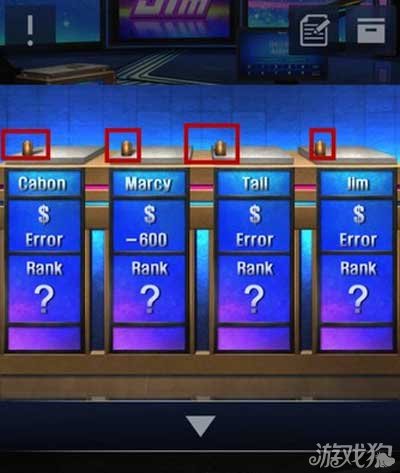 按选手台上的抢答器可知红色代表Cabon、黄色代表Marcy、紫色代表Tail、绿色代表Jim