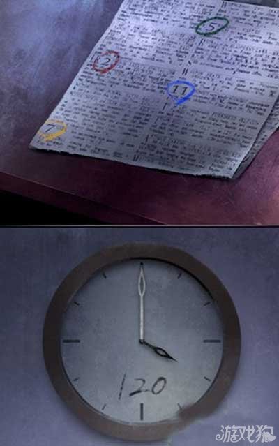 5、点击左侧桌子上的报纸,一组数字2,5,11,7被各种颜色的圆圈围住,这时候我们回去看时钟,时针指向四点,下面的数字是120,一个圆圈360度,所以每一点是30度。那么我们就可以得出2=60,5=150,11=330,7=210