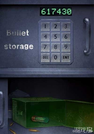找到红色门下的保险柜,输入数字617430,打开保险柜得到一个绿色的子弹