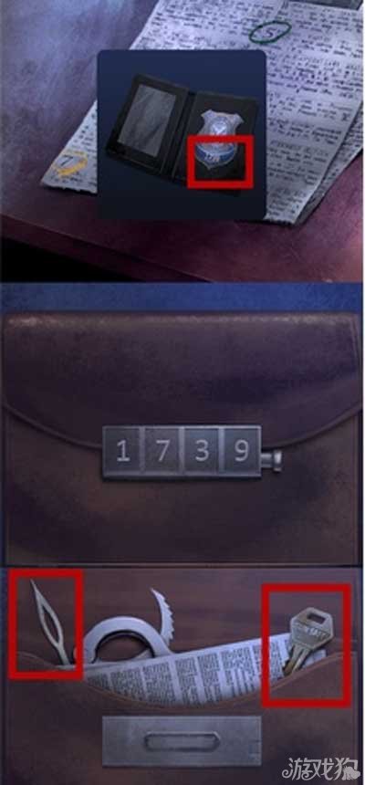 在左边的桌子上找到军官证,军官证上有数字1739,就是地上公文包的密码。输入密码1739打开公文包得到钥匙一把和一个表针