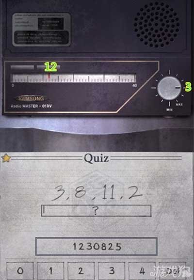 地上有个习题本是QUIZ,一组数字3,8,11,2,下面一个长条。下面的长条就是代表收音机的刻度,我们就要从收音机处入手。找到收音机,发现收音机左侧是一个刻度,共40格,每格代表1;右边一个旋钮,旋钮类似时钟共12格。那么我们就将3,8,11,2这组数字依次扭动旋钮,发现左侧的刻度是会改变的。那么我们得出3=12,8=30,11=8,2=25,所以最终quiz的答案是1230825