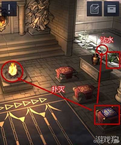 首先在如图右下角位置拿起一个垫子,在外面将垫子打湿后把左边的篝火扑灭。打湿垫子的时候能找到制作蛇笛用的草。