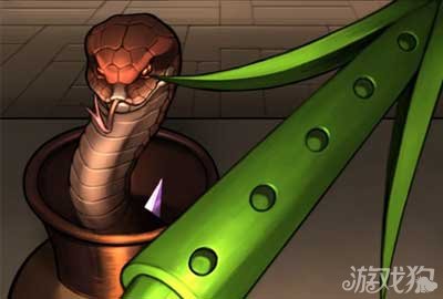然后将匕首和草结合制作出蛇笛,用蛇笛点击右边台子上的蛇。这时候使用蛇笛,让蛇离开。使用蛇笛的具体顺序为从上往下数,342452的顺序按动小孔。蛇离开后能得到一个四角星。