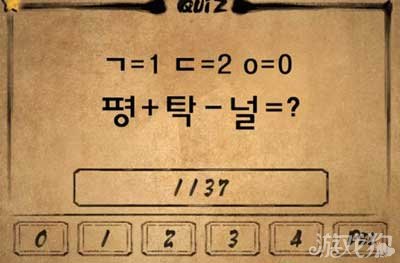 本关的Quiz和韩文无关,而是需要玩家来观察。根据上面的提示,数字带表的是该文字有几个直角。那么下面就好办了,只需要将几个韩文拆分成三个部分左上、右上、下即可,然后数出每个部分有几个直角,那么以第一个韩文为例,左上有八个直角,即代表8,右上有四个直角,即代表4,下方没有直角,即是0。那么第一个韩文代表的是840。后面以此类推就好,最后算出结果为1137。