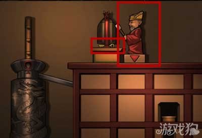 在刚刚的柱子左侧有个柜子,将人偶放在柜子上如图位置,点击人偶人偶就会敲钟。敲过钟后能在钟下拿到一把钥匙。