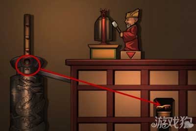 然后在旁边的一个仪器上,将之前从门上龙口中得到的珠子放进圆形的孔中,柜子下方就会出现一个奇怪的装置。