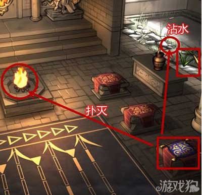 本关的第一个比较让人难以发现的就是关于那个垫子的正确使用方法。这个垫子是需要玩家将它拿到外面沾水打湿之后,用来将中间的火堆给熄灭。熄灭后才能得到新的道具。