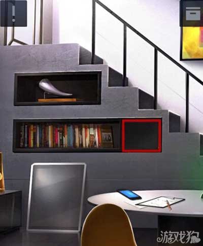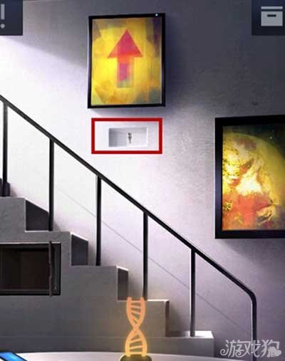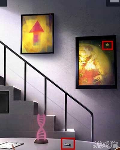然后使用遥控器点击如图向上箭头的画,画就会向上移动,玩家就能得到画像后面的钥匙了。
