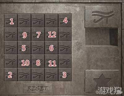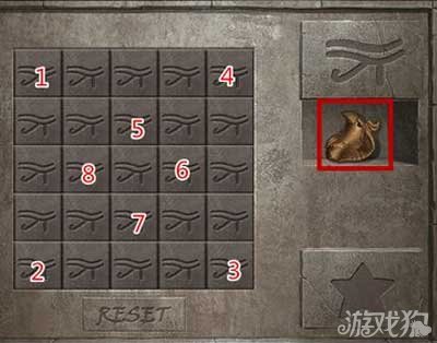 上面那个图案打开,玩家可以获得法老王权杖的头部,但是这种需要规律的题目,玩家不尝试一下是没办法找到规律的。可是很多情况下就是找到规律时,整个版面就已经变得纷乱不堪,这时候想要再来变化就变得很难了。所以上图给出玩家点击的顺序和位置,只要按照图中所指的来点击,就能成功的获得权杖头部。